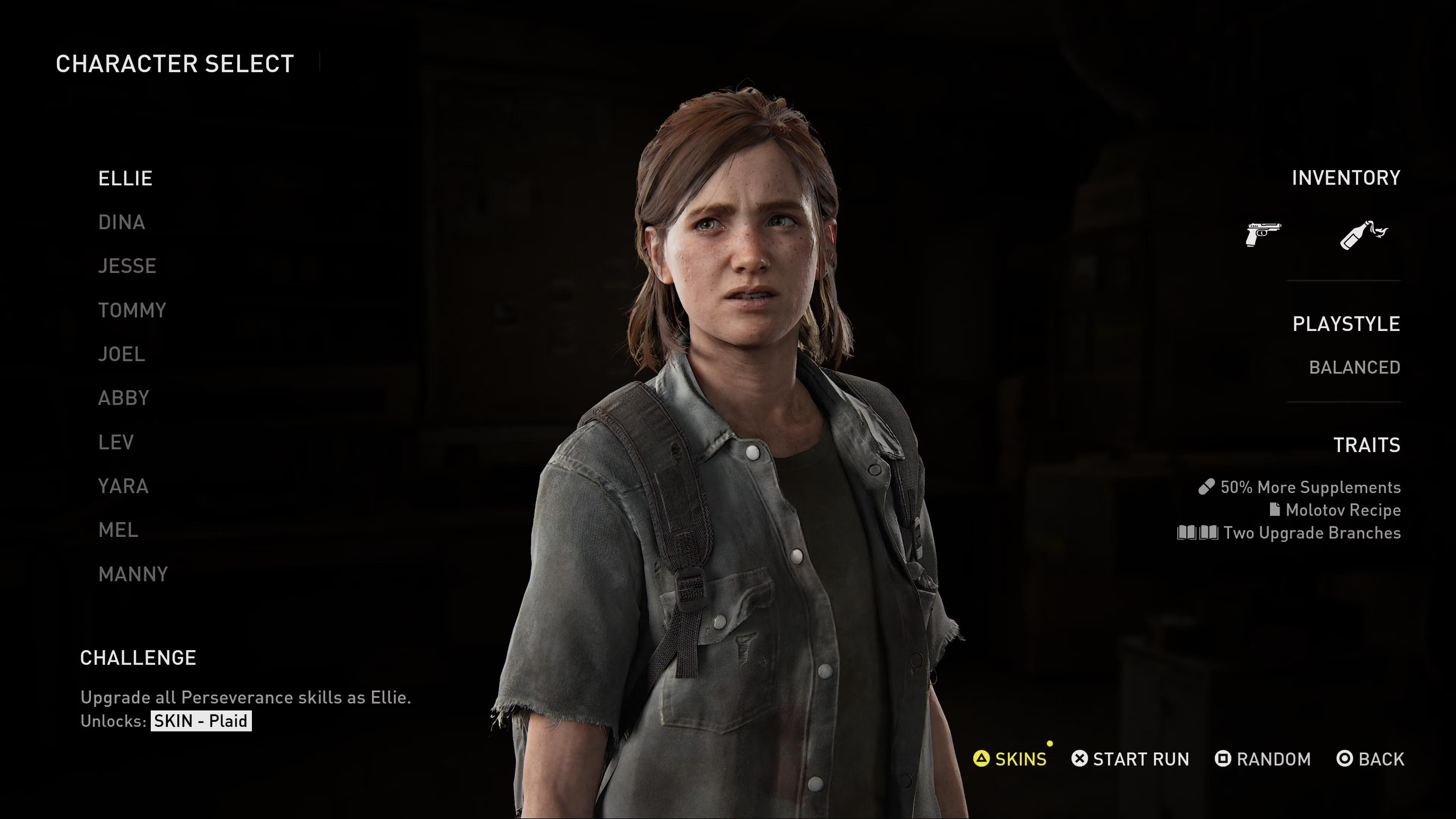 Элли – стартовое оружие: полуавтоматический пистолет и коктейль Молотова; навыки: находит на 50% больше предметов для крафта, может делать коктейли Молотова, имеет две ветки прокачки.
