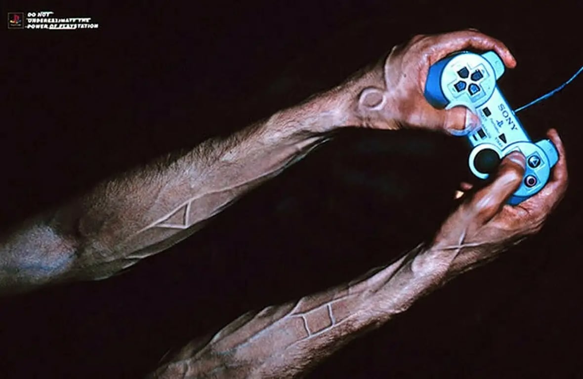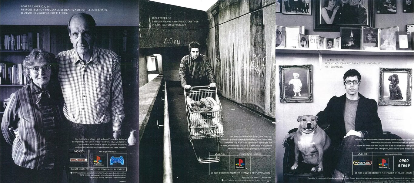 Схожие темы Sony поднимала и в журналах. Была целая серия реклам с монохромными фотографиями самых обычных людей. Но надписи над ними рассказывали о том, как они получали самый неординарный опыт благодаря видеоиграм. «Джордж Андерсон, 64 года. Ответственен за тысячи смертей и безжалостных побоев, вот-вот узнает, каково это». Последнее — намёк на виброотдачу дуалшока.
