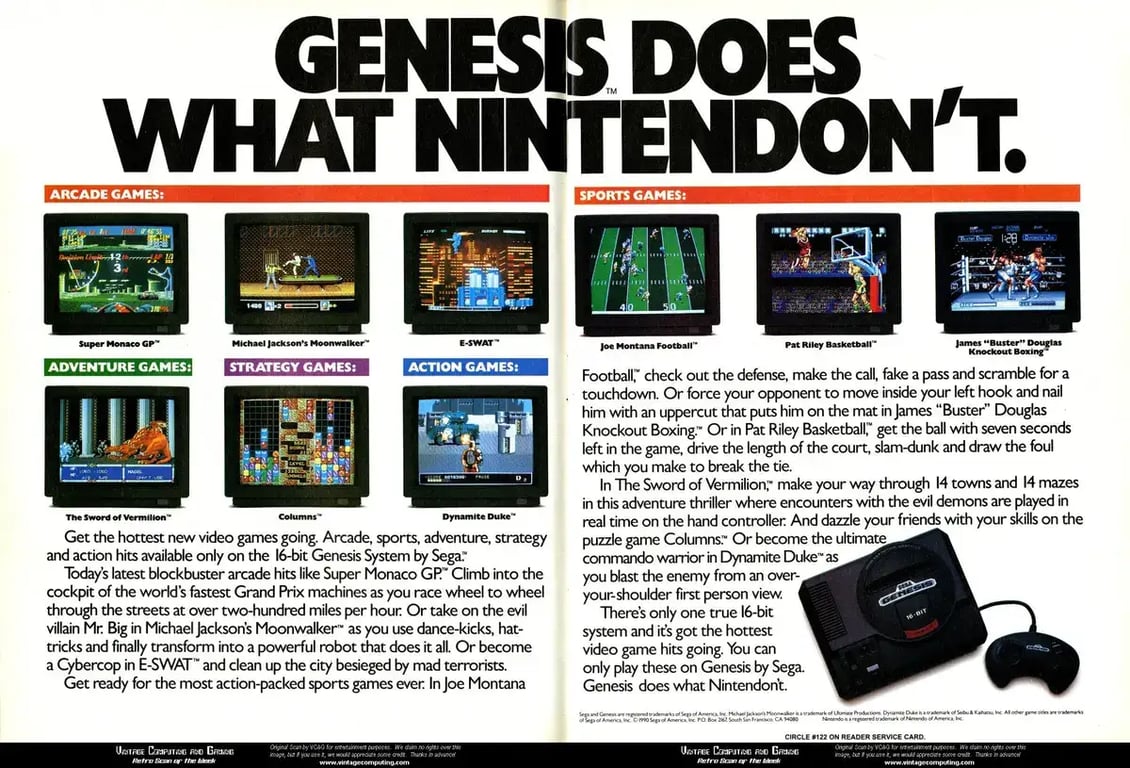 Тогда все постоянно кичились мощностью своего железа и ругали конкурентов. The 3DO Company в телевизионной рекламе называла свою консоль самой совершенной и показывала, как SNES и Sega Genesis, кажется, навсегда отправляются в ящик для игрушек. В роликах Atari постоянно звучал слоган «Do the math» («Считай сам»), с помощью которого выставляли идиотами тех, кто всё ещё играл на 16-битных консолях, когда на рынке появилась якобы 64-битная Atari Jaguar. А Sega упорно повторяла «Sega Does What Nintendon't» («Сега может то, что Нинтендо — нет») и говорила о каком-то непонятной blast processing (взрывной обработке) у своей приставки, что почему-то делала её круче SNES.