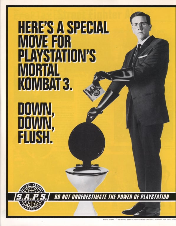 Методика «Разрыва» уже лучше угадывалась в серии роликов SAPS, «Общество Против PlayStation», в 1995 году. Это пародия на американскую пропаганду 50-х, в которой карикатурно злобный правительственный агент рассказывал совершенно абсурдные примеры того, как консоль подрывала мораль и превращала игроков в обезьян. В одной из реклам он вообще предлагал играться с палкой, а не с вредными видеоиграми. И в конце звучал слоган «Не недооценивайте силу PlayStation» — что вроде бы показывало мощь приставки, но в то же время было пародийным призывом запретить консоли.