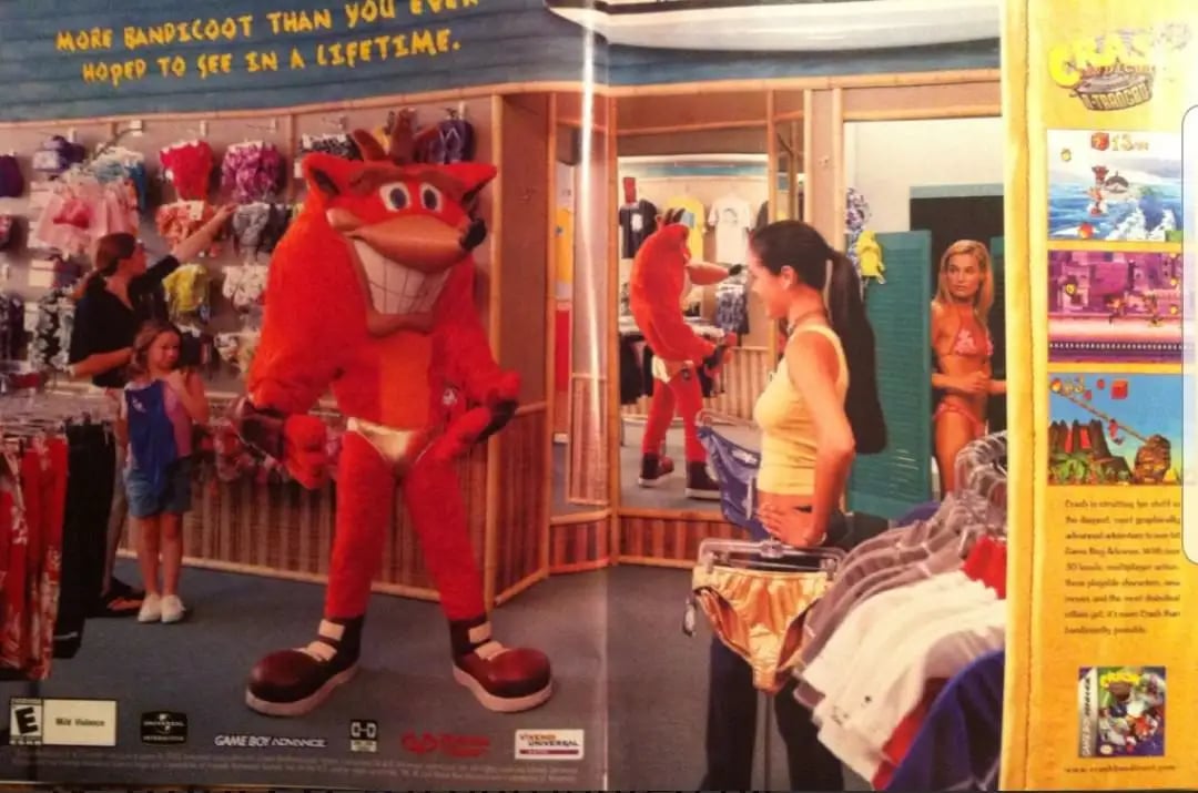Вообще удивительно, как часто Крэш годами появлялся в рекламе с сексуальными намёками. Позировал для карточки с намёком того, что он согласен на секс. Стоял в узких труселях в отделе женской нижней одежды, а рекламная надпись намекала на то, что у него большой член. Бандикут подмигивал, когда его целовали две молоденькие азиатки. То же самое зверь делал на постерах с кучей женских персонажей игры — причём там ещё виднелся панцушот.